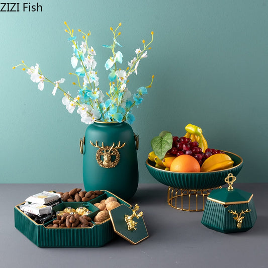 Modern Dark Green Deer Head Tissue Box Storage Box Candy Fruit Tray Flower Vase Resin Ceramic Exquisite Crafts Luxury Home Decor