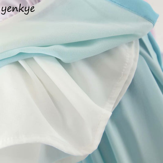 Multicolor Gradient Print Long Maxi Dress Women V Neck Long Sleeve Ruffle Holiday Boho Beach Dress A-line Chiffon Dress