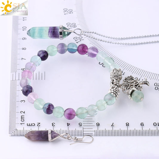 CSJA Reiki Natural Stone Jewelry Set for Women Men Fluorite Bracelet Hexagonal Bullet Shape Necklace Purple Crystal Earring F644