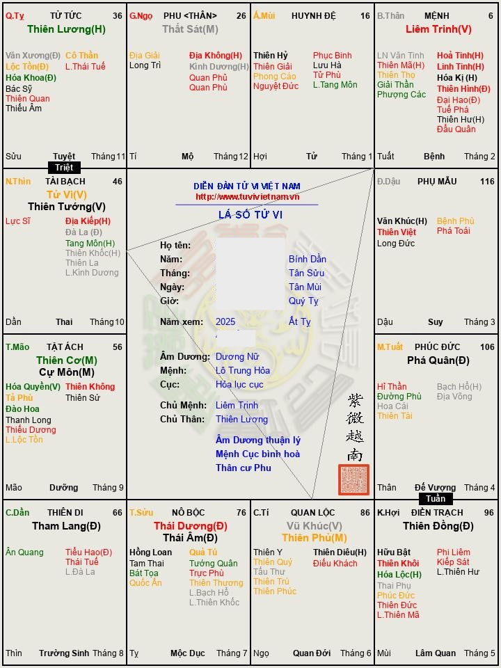Lá số tử vi Dương Nữ, sinh giờ Tỵ, ngày 23, tháng 12, năm Bính Dần