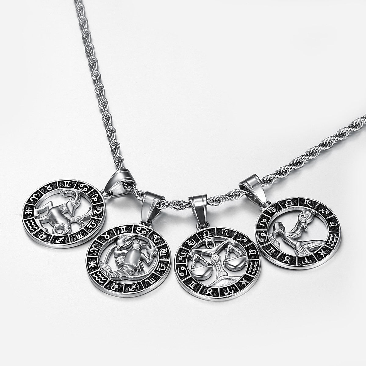 Silver Color 12 Constellation Zodiac Pendant Necklace Punk Retro High Quality Stainless steel Rope Chain Horoscope for Men