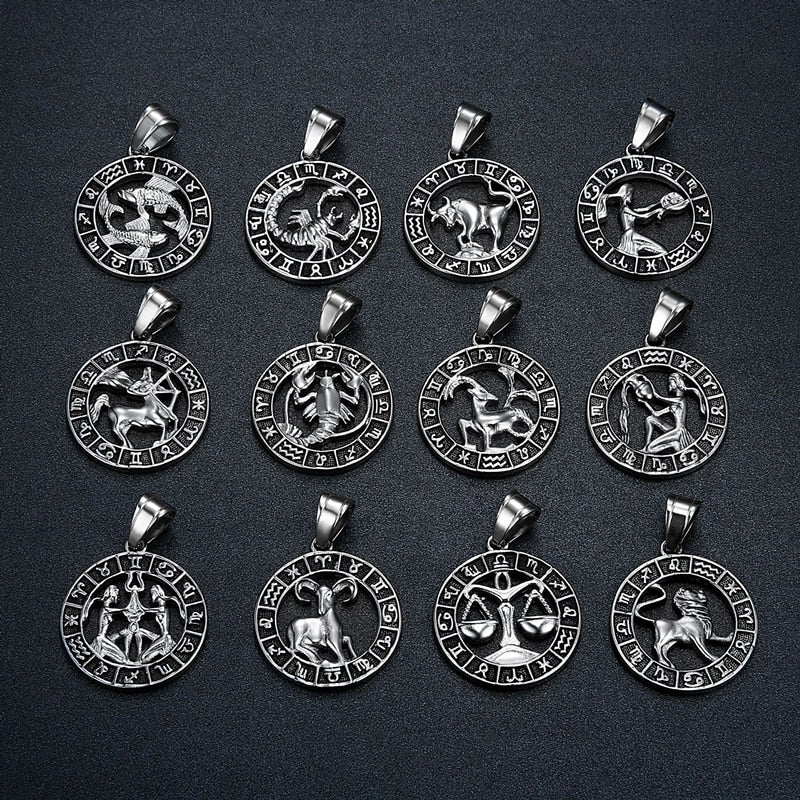 Silver Color 12 Constellation Zodiac Pendant Necklace Punk Retro High Quality Stainless steel Rope Chain Horoscope for Men